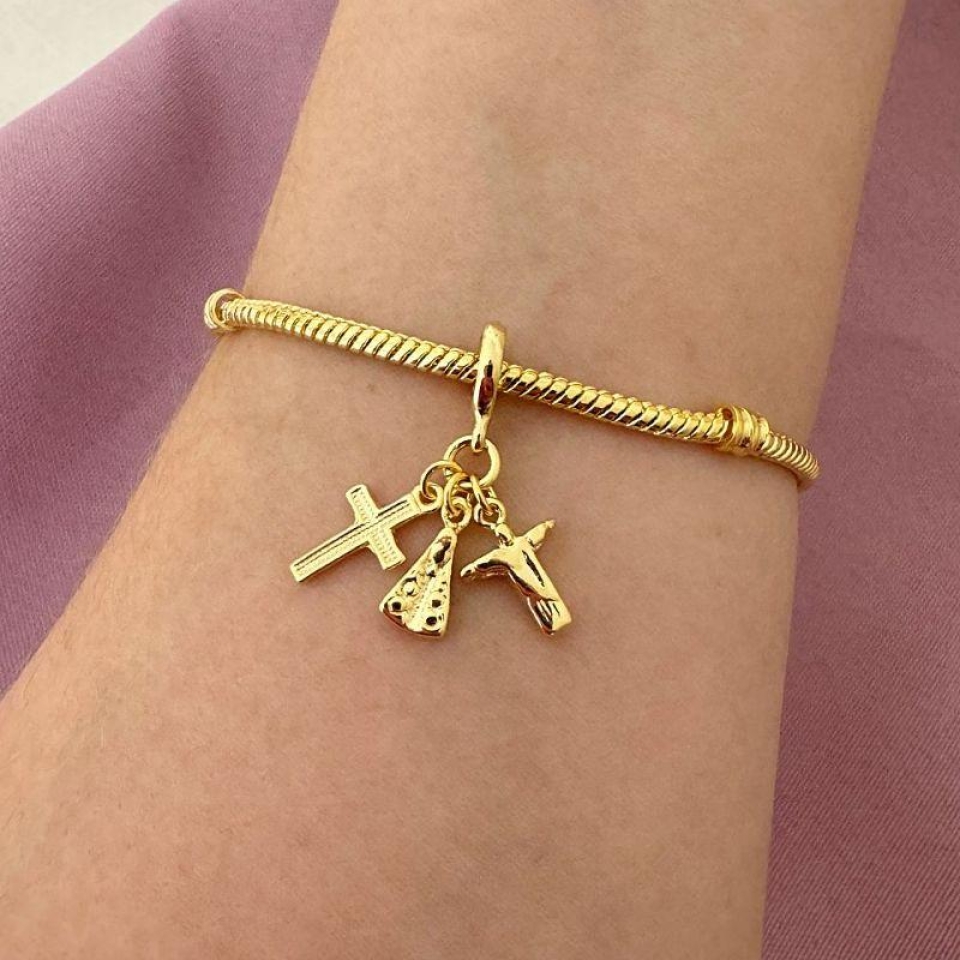 Um berloque para carregar fé, proteção e significado todos os dias. O Berloque Trio Religioso Ouro reúne Nossa Senhora, Cristo e uma cruz, simbolizando devoção, espiritualidade e momentos de conexão com o que é mais importante. Tenha sempre essas lembranças e crenças por perto na sua pulseira de berloques, conte sua história, mostre sua fé e mantenha um visual elegante e cheio de personalidade todos os dias.