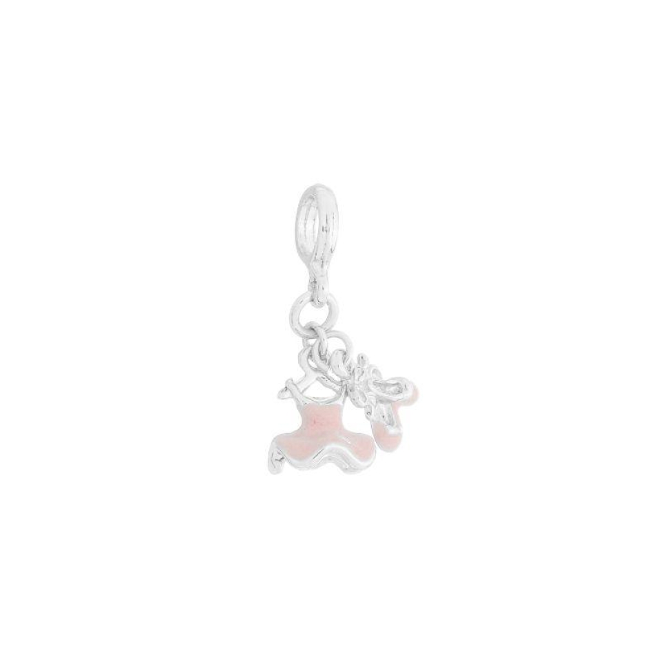 Delicado e encantador, esse berloque em banho de prata traz dois pingentes: um vestido de bailarina e uma sapatilha, simbolizando graça, leveza e paixão pela dança. Uma peça perfeita para pulseiras e colares, ideal para quem ama ballet e deseja adicionar elegância e movimento aos acessórios.